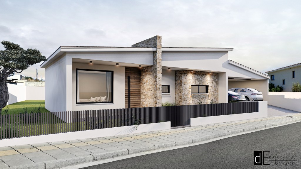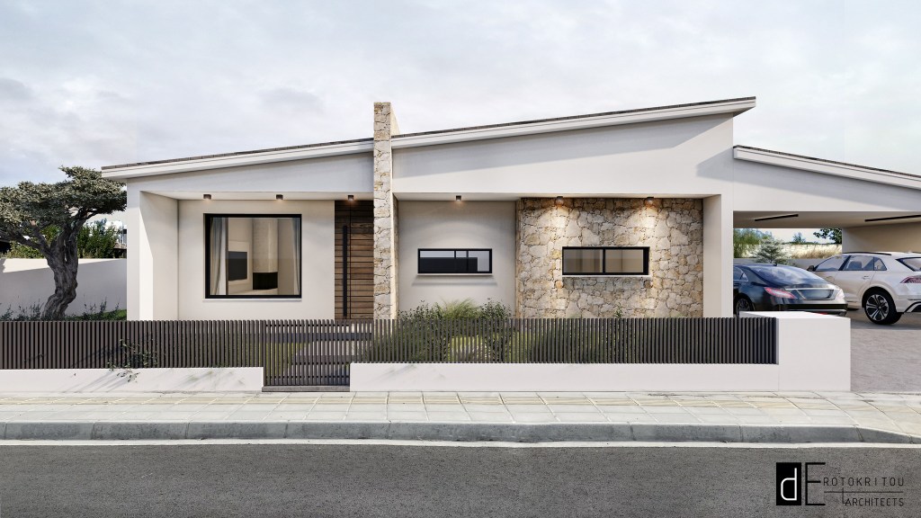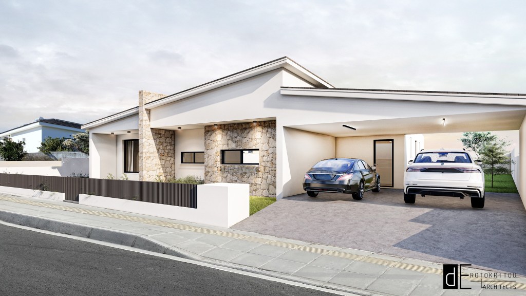 The NN Residence was designed in the mountainous area of Lythrodontas, in the Nicosia district. It is a single-storey home, characterized by its sloped roofs on the front façade, creating a dynamic contrast between the angles of the house and the garage roofs.