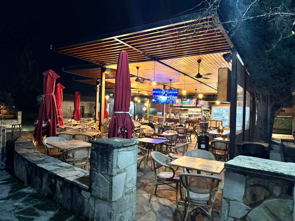 The pergola features a metal structural frame combined with wooden beam cladding, materials carefully selected to harmonize with the surrounding environment. The result is a dynamic yet welcoming structure, enhanced by semi-shading perimeter screens that define the space while maintaining visual openness and uninterrupted views toward the nearby church of Panayia Angeloktisti in Kiti.